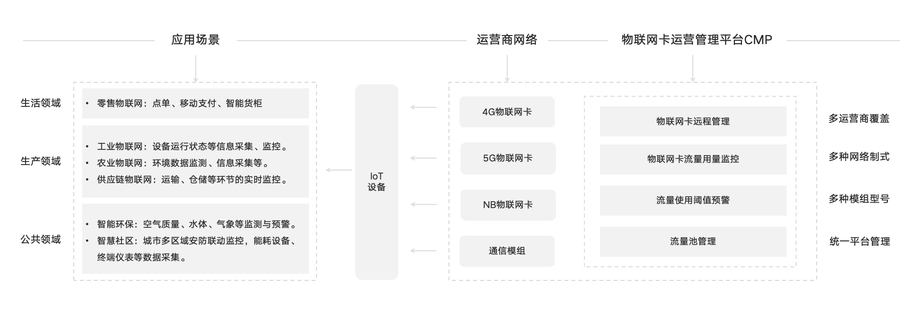 直连四大运营商,提供蜂窝网络连接方案,提供从卡片采购、激活到流量管理的全流程服务,以支持不同设备的广域联网需求。